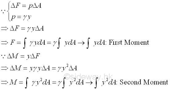 Since the elemental force or the distributed forces is a function the depth y, the resultant force F can be determined by making use of the first moment of the body. Similarly, since the elemental moment of the distruibuted forces about a reference is a function of the square of the depth y, the resultant moment M can be determined by making use of the second moment of the body. And the point of application y of the resultant force F can be determined through system of forces transformation by equating the moment of the two system of forces. Imply